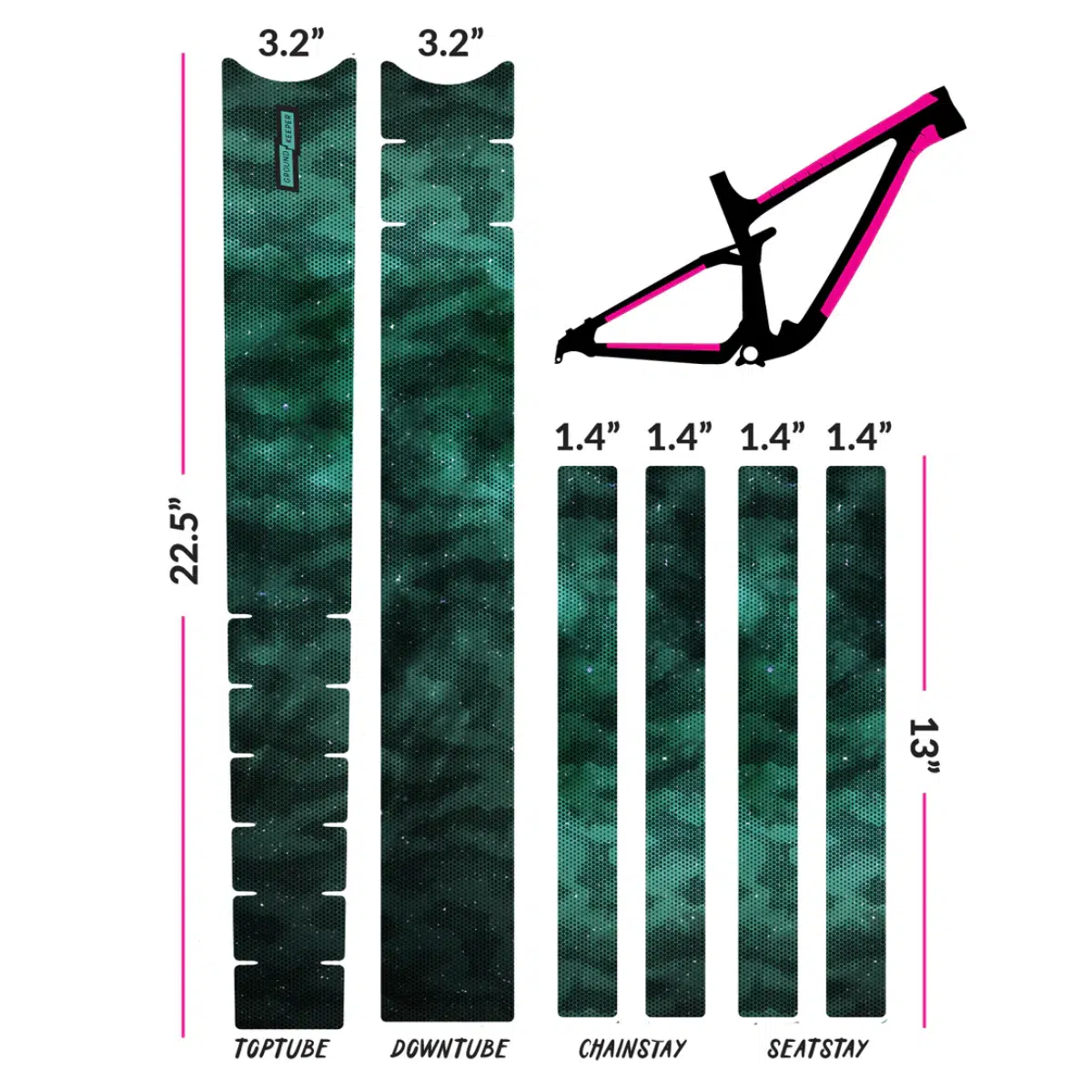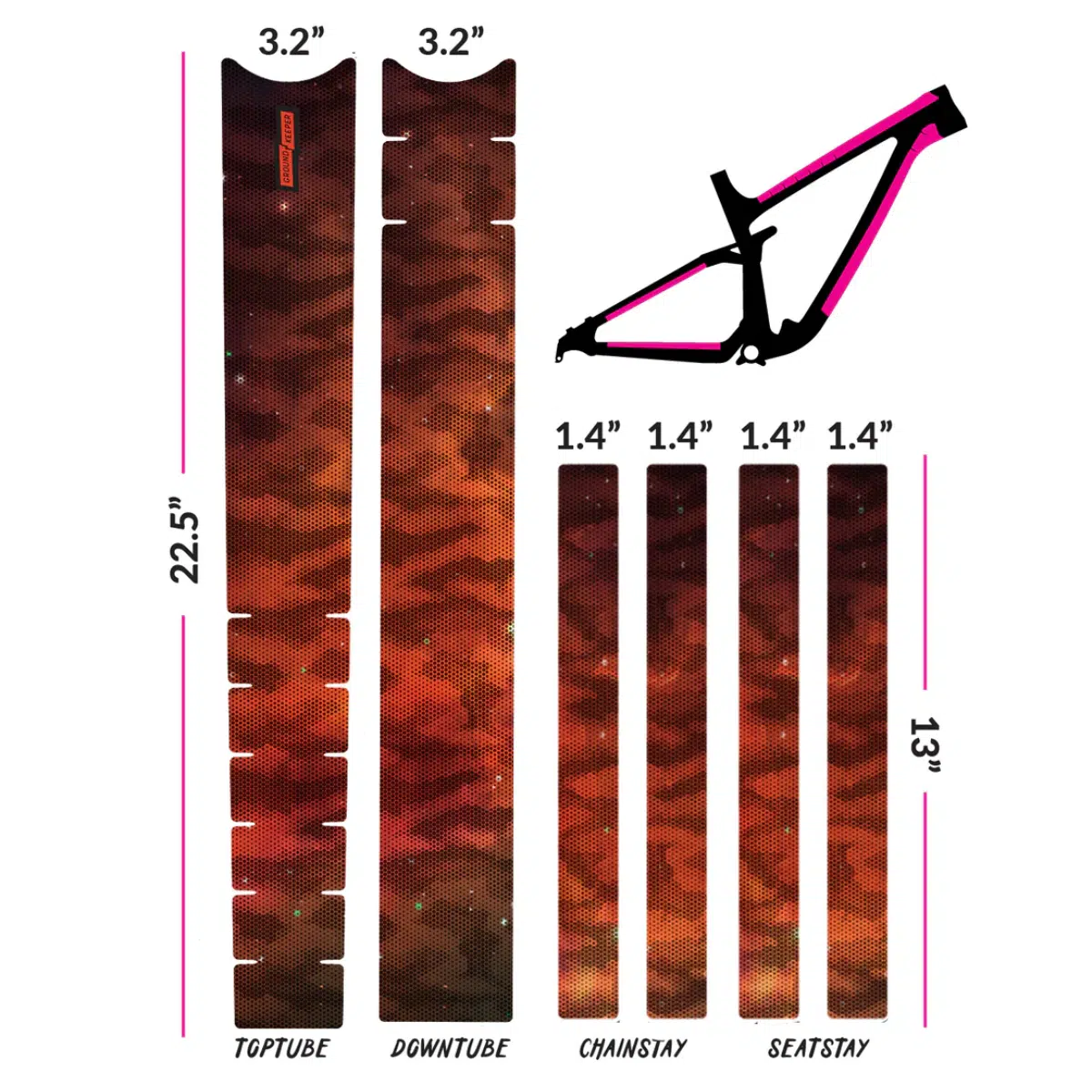Nuestro kit universal está diseñado para adaptarse a todas las bicicletas y tamaños y viene con 6 piezas fáciles de recortar para el tubo superior, el tubo inferior, las vainas y los tirantes. Diseñado para adaptarse a cuadros XL, cada pieza se puede recortar al largo y ancho deseados.